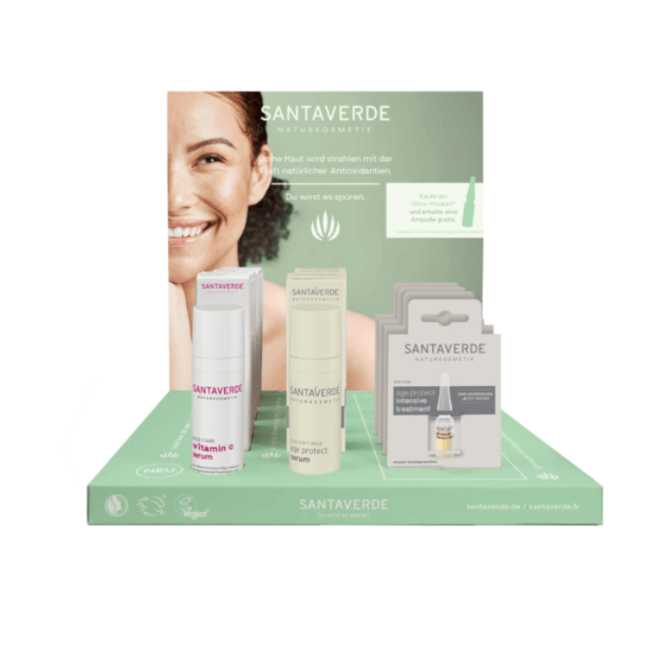 Display för att visa upp nyheten Vitamin C & Q10 serum tillsammans med Age protect serum. Displayen är perfekt för kassadisken eller på en hylla i salongen eller butiken.