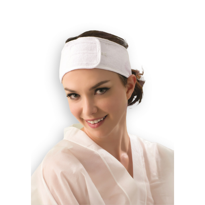 Hårband Smal är ett hårband med kardborrefäste som är 8 cm brett. Hårbandet håller håret på plats vid ansiktsbehandlingar och är en tvättbar, vit bomullsfrotté.