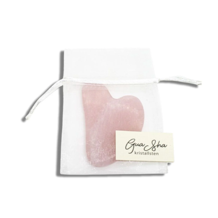 Gua sha-kristallen Rosenkvarts, finns i olika nyanser av rosa. Det är en avlång och hjärtformad kristall som är böjd. Den är cirka 8 cm lång och 3 till 5 cm bred med mjuka kanter. Gua sha-kristallens material och utformning är skonsam och effektiv. Den är lätt att massera med i ansiktet och kommer enkelt åt muskulaturen. Metoden är inspirerad från traditionell kinesisk medicin som stimulerar huden genom skonsam skrapning.